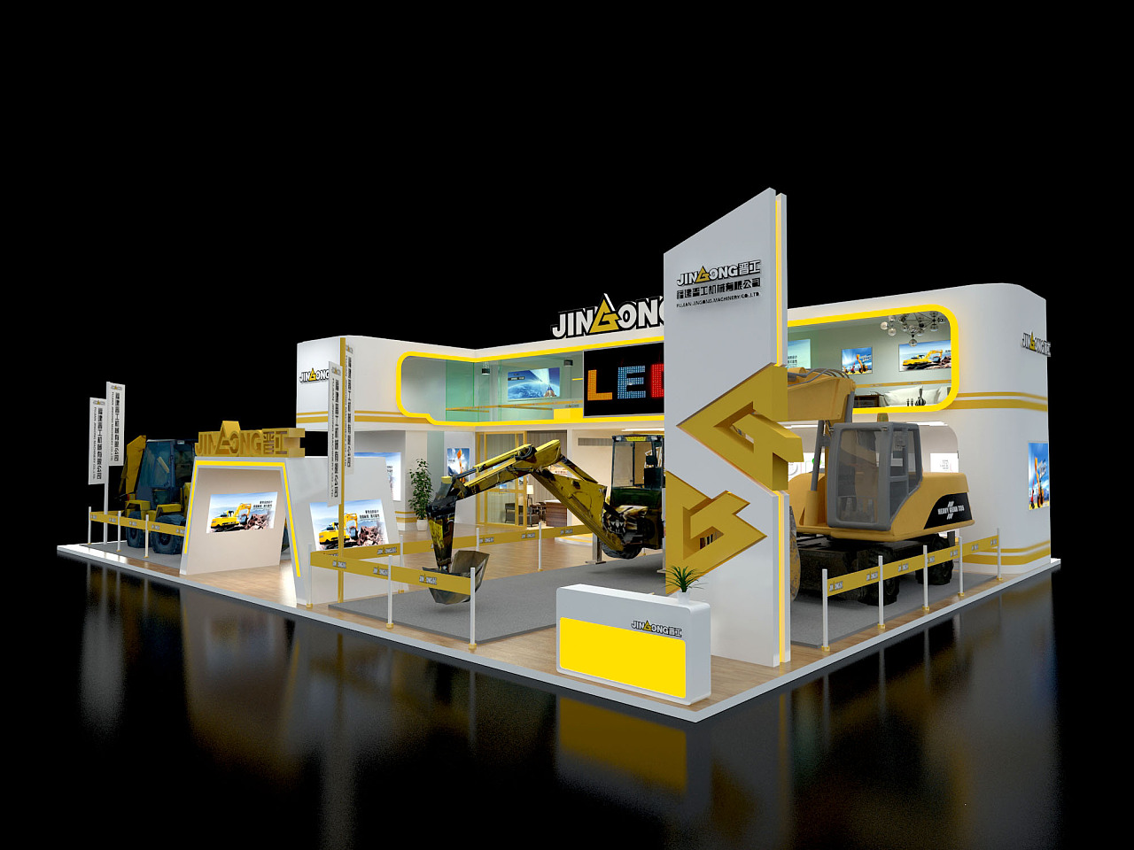 在展臺(tái)設(shè)計(jì)方面,美刻會(huì)展在接觸晉工機(jī)械時(shí),科技力量是晉工機(jī)械給人的第一印象。因此在展臺(tái)設(shè)計(jì)整體方面是以科技感突出科技力量的印象。